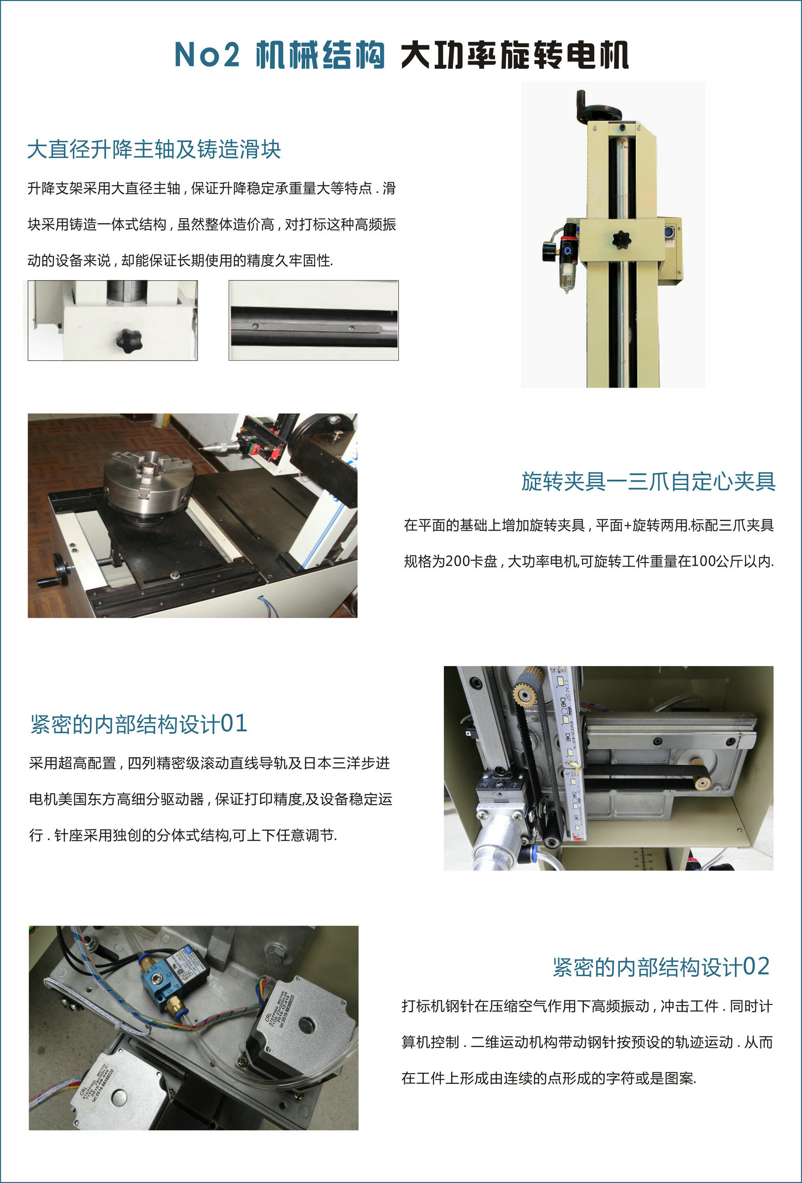 打標(biāo)機(jī)頭后面配有圓形卡盤 打印頭360度旋轉(zhuǎn)。可實(shí)現(xiàn)臥式和水平打印等多種打印方式,支持三軸聯(lián)動打標(biāo)方式。打印深度:0.01-2mm 深度可調(diào)。