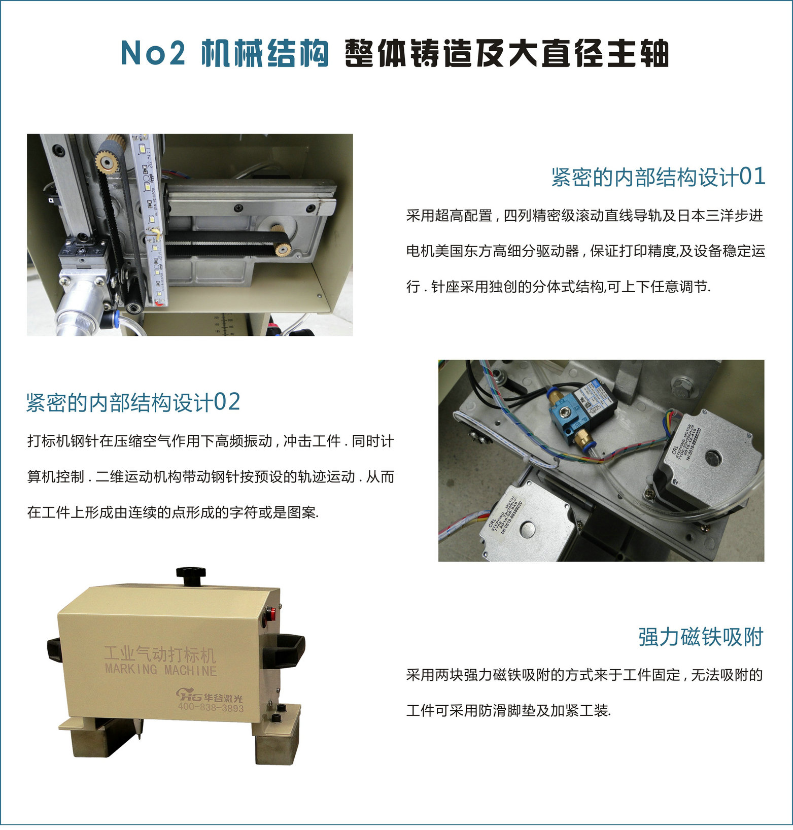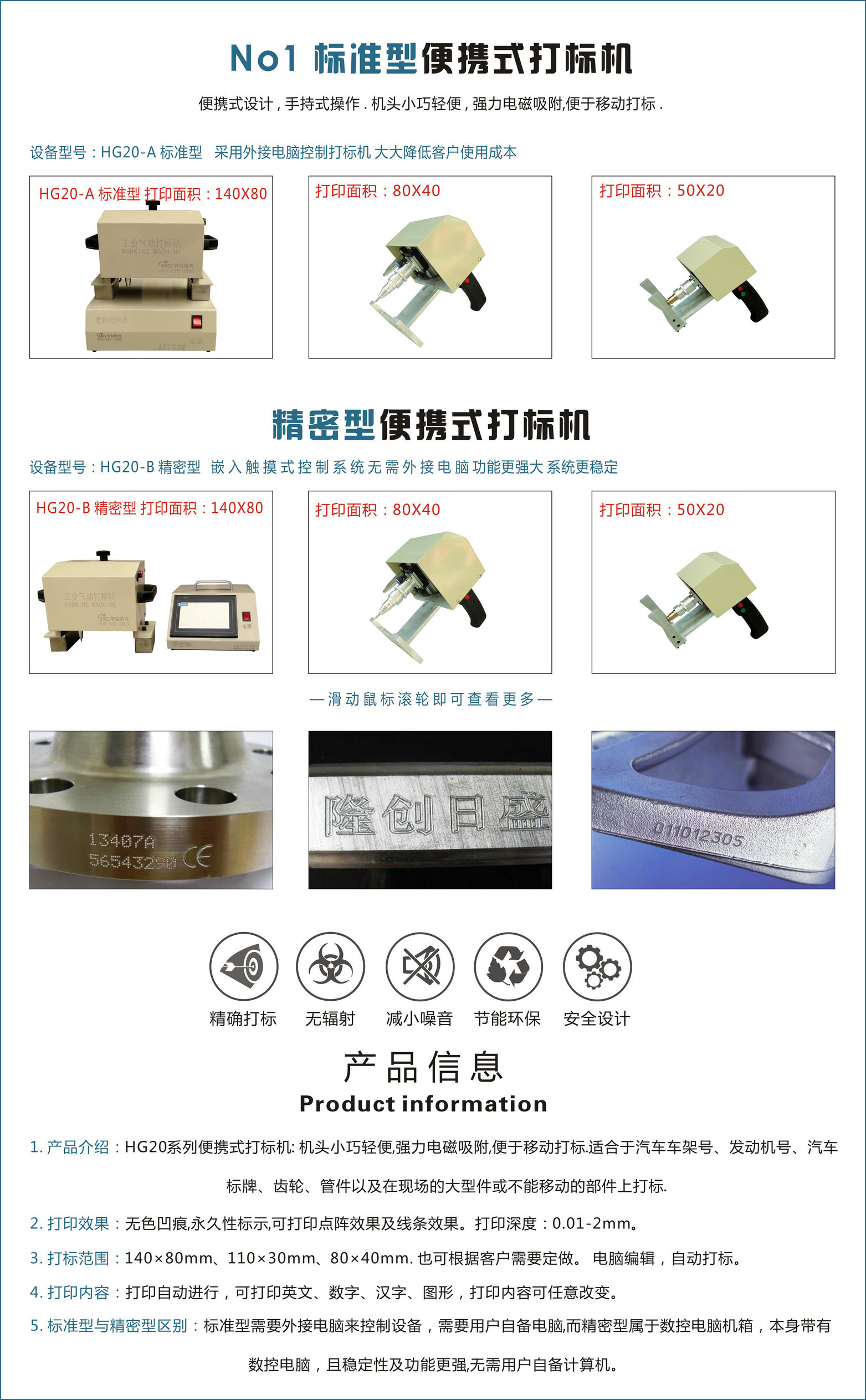 機(jī)頭小巧輕便,強(qiáng)力電磁吸附,便于移動(dòng)打標(biāo)。適合于汽車車架號(hào)、發(fā)動(dòng)機(jī)號(hào)、汽車標(biāo)牌、齒輪、管件以及在現(xiàn)場的大型件或不能移動(dòng)的部件上打標(biāo)。打標(biāo)范圍:平面140×80mm、110×30mm、80×40mm