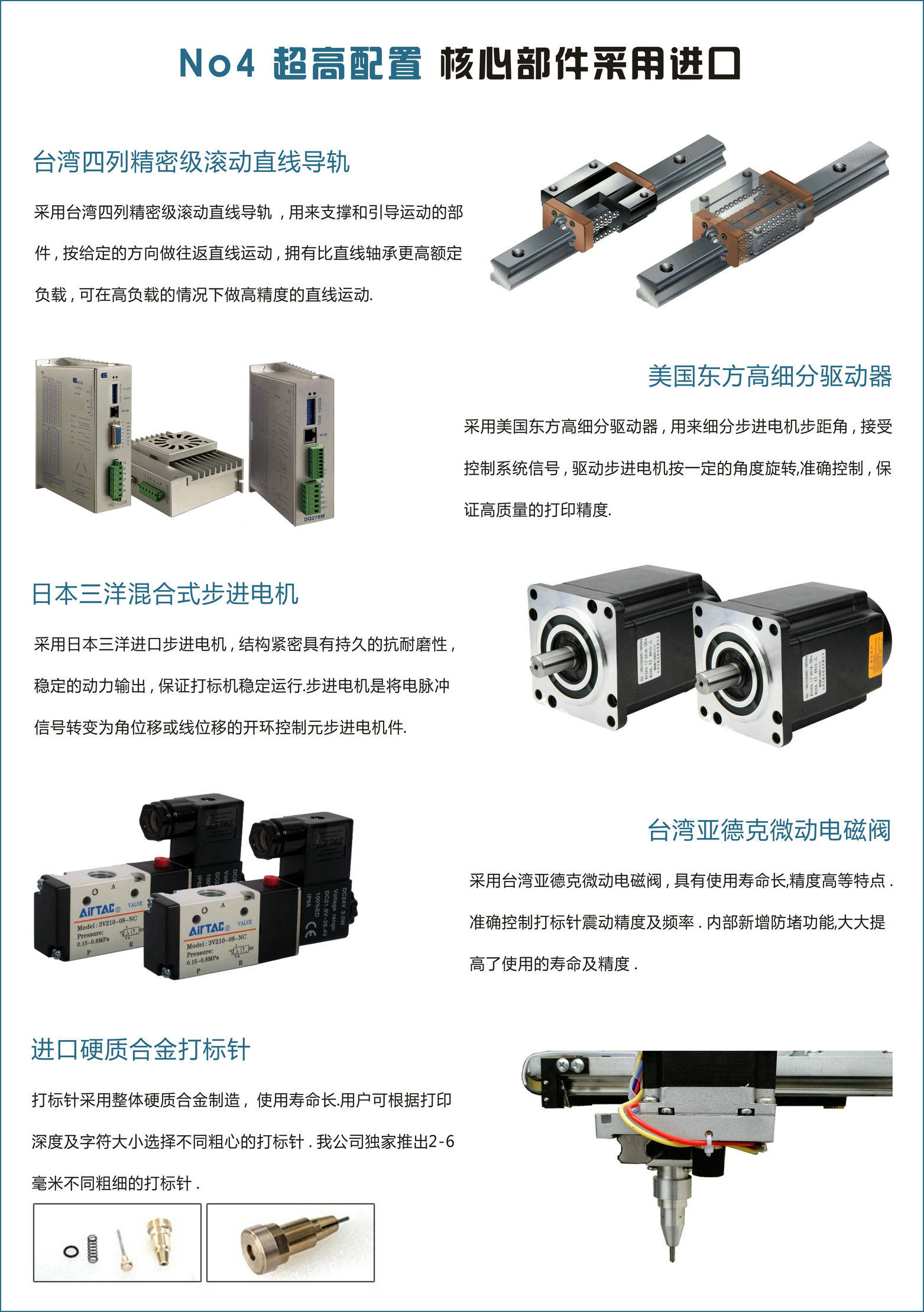 配置說明:關(guān)鍵部件均采用進(jìn)口元件,臺(tái)灣四列精密級(jí)滾動(dòng)直線導(dǎo)軌,日本三洋步進(jìn)電機(jī),日本歐姆龍觸發(fā)式傳感器關(guān),臺(tái)灣亞德克微動(dòng)電磁閥。
