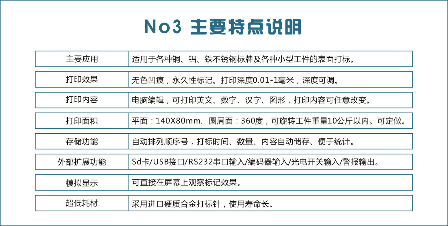 6、儲(chǔ)存功能 :自動(dòng)排列順序號,打標(biāo)時(shí)間、數(shù)量、內(nèi)容自動(dòng)儲(chǔ)存、便于統(tǒng)計(jì)。