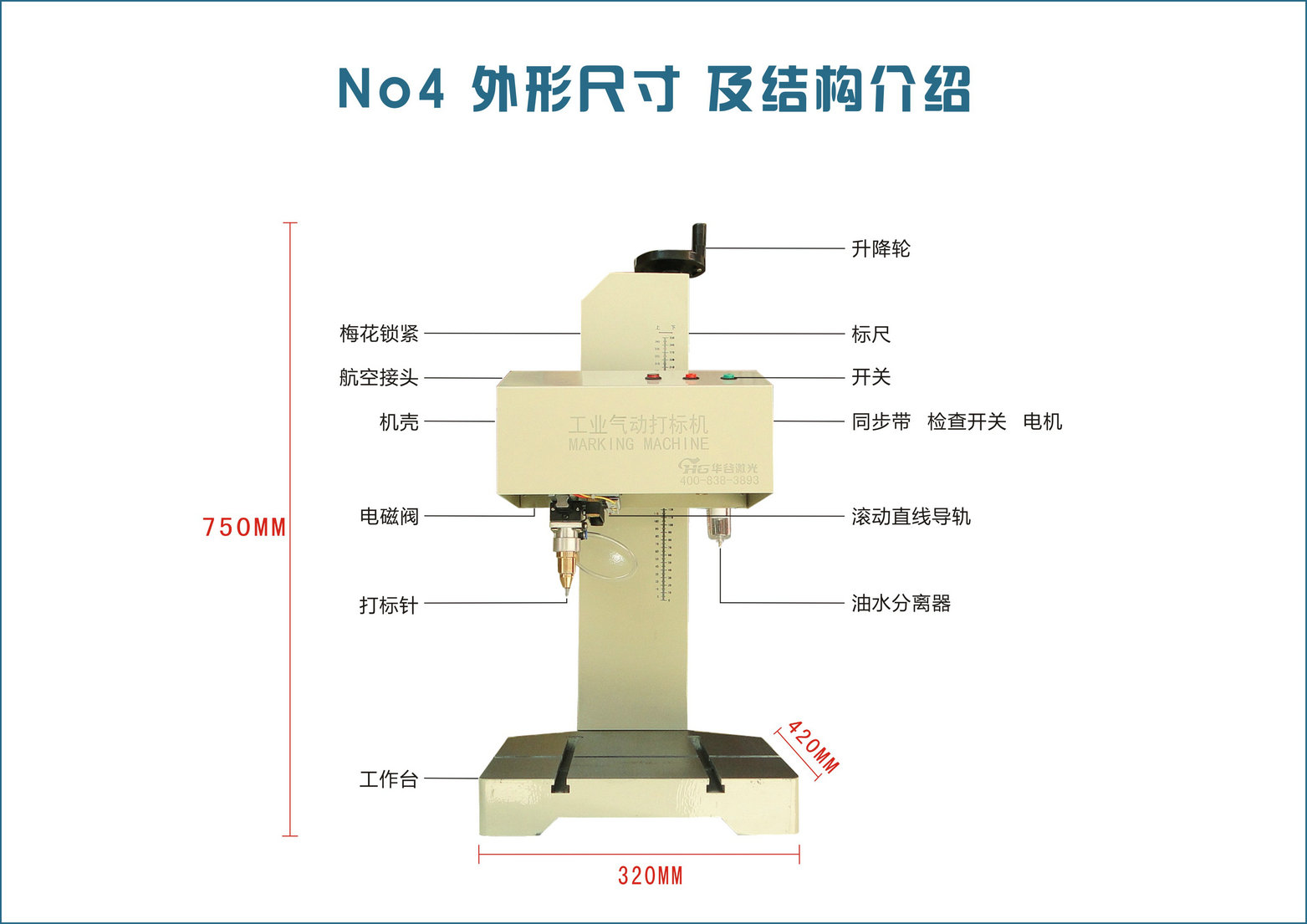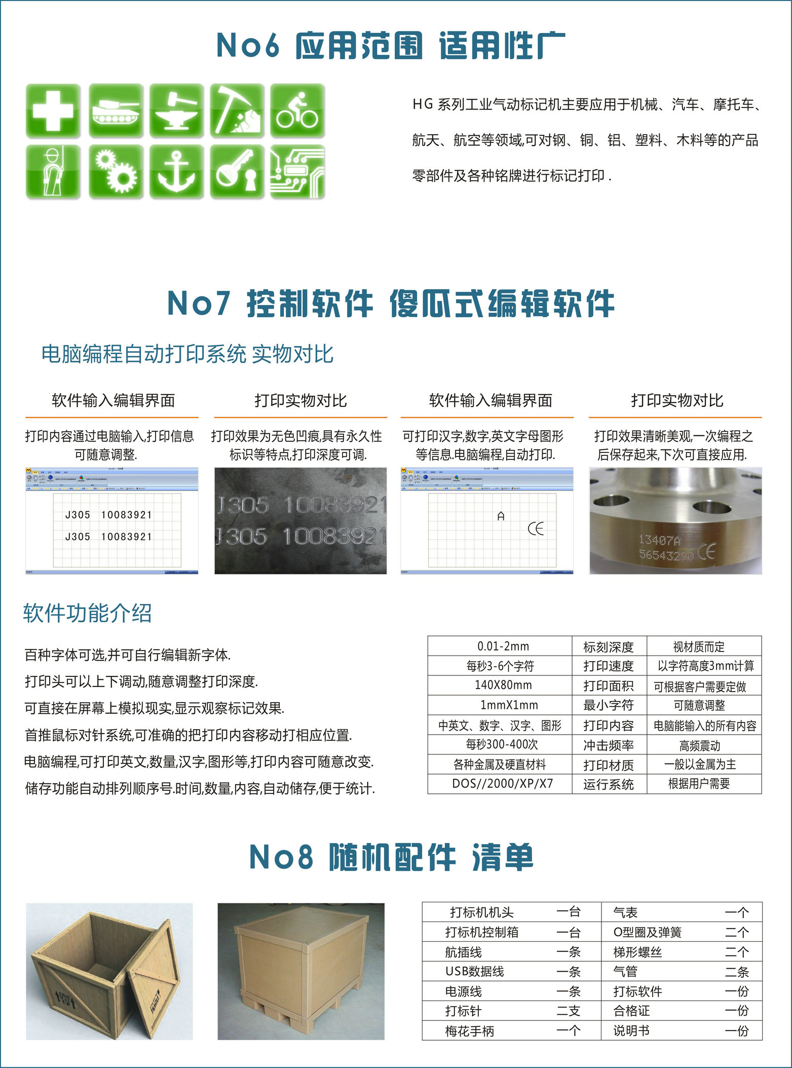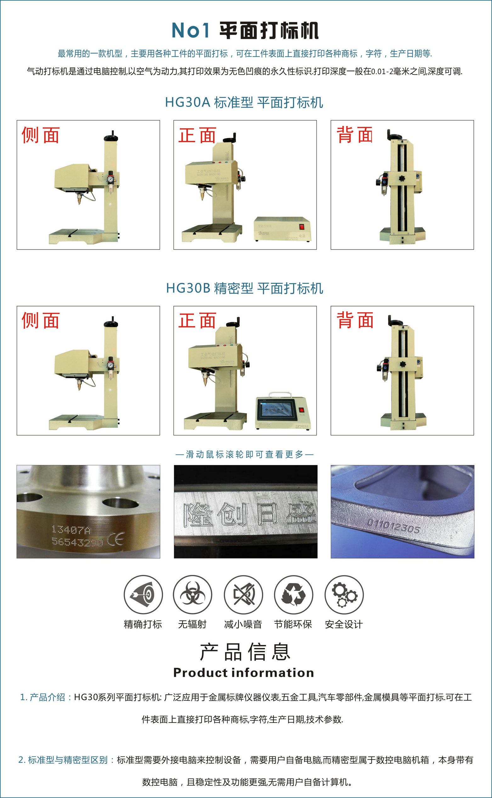 HG30系列平面打標機: 廣泛應用于金屬標牌儀器儀表,五金工具,汽車零部件,金屬模具等平面打標可在工件表面上直接打印各種商標,字符,生產(chǎn)日期,技術參數(shù).打標范圍:平面140×80mm 打印深度:0.01-2mm