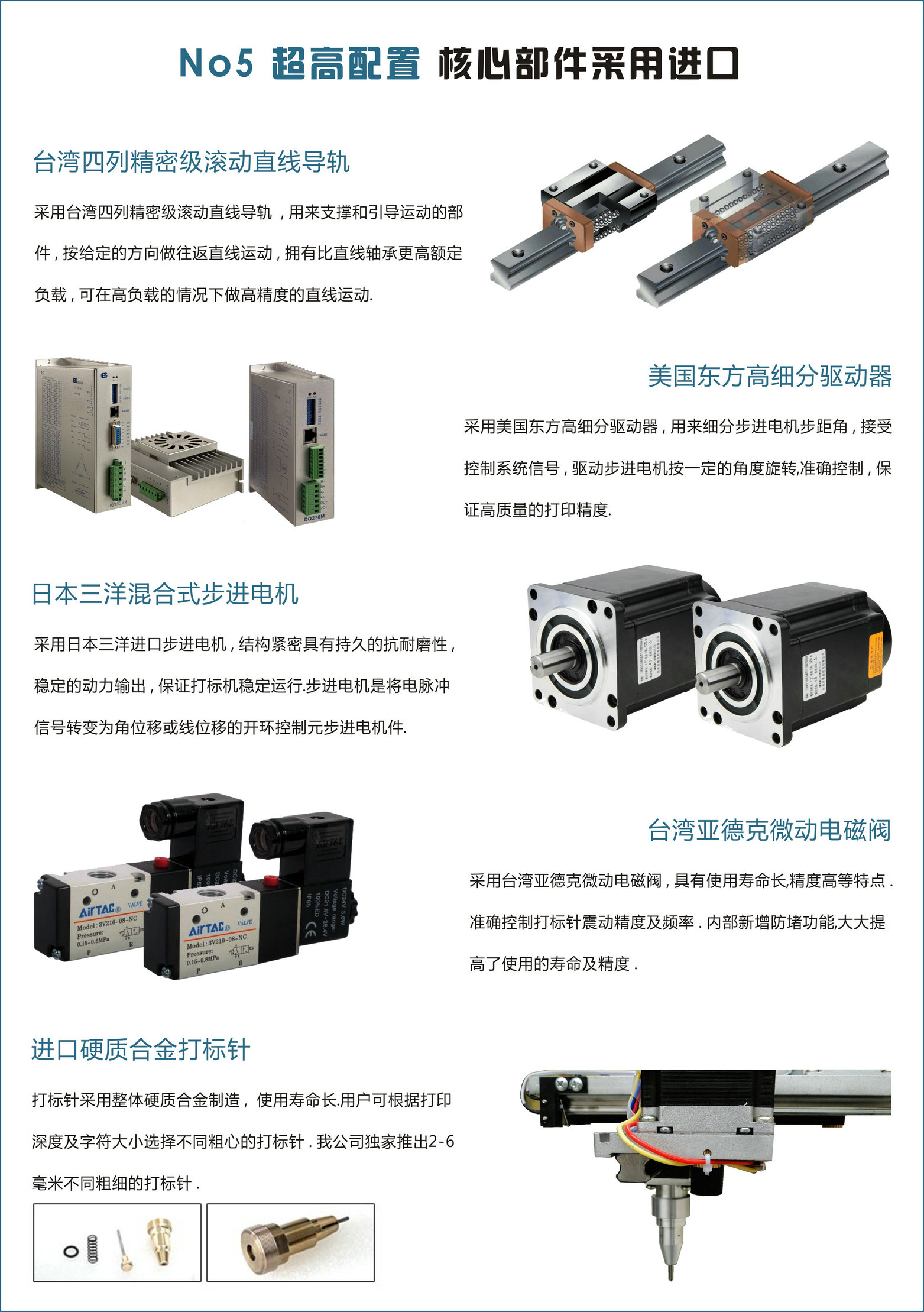 配置說明:關鍵部件均采用進口元件,臺灣四列精密級滾動直線導軌,日本三洋步進電機,日本歐姆龍觸發(fā)式傳感器關,臺灣亞德克微動電磁閥。